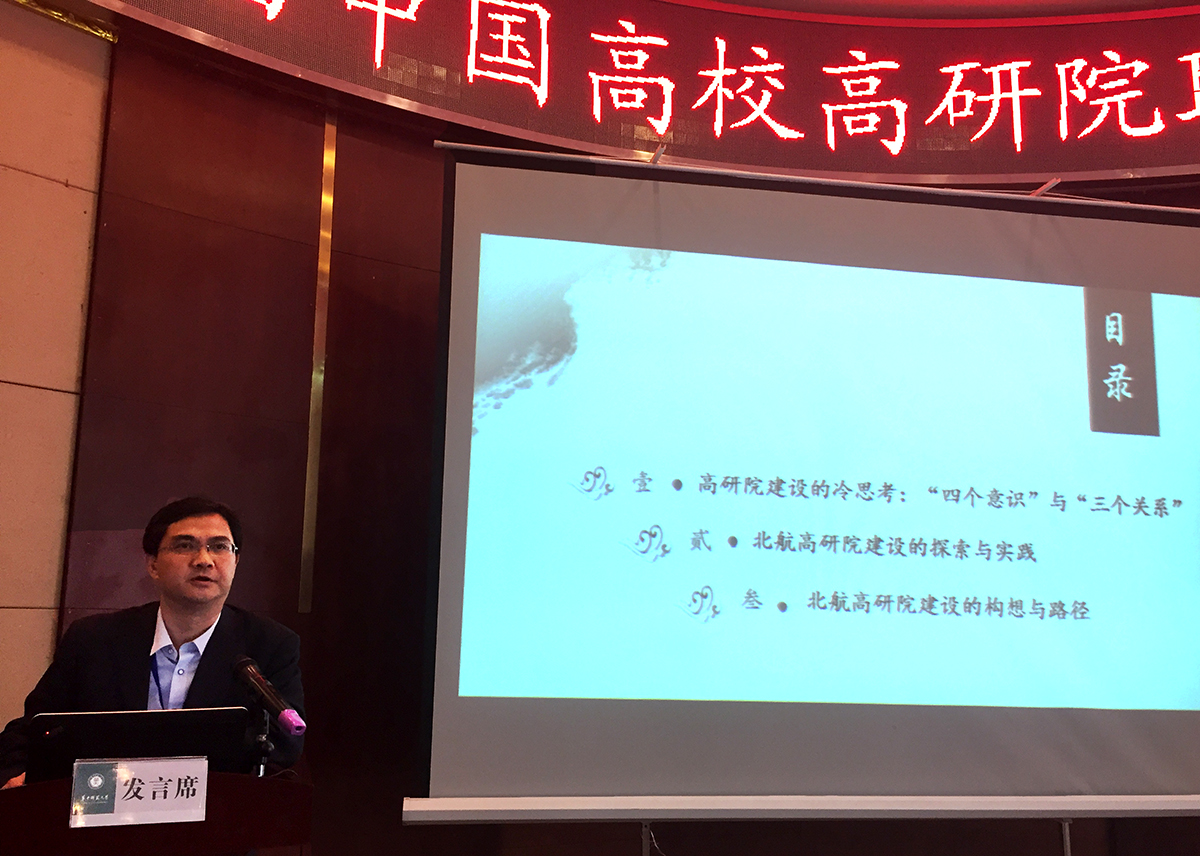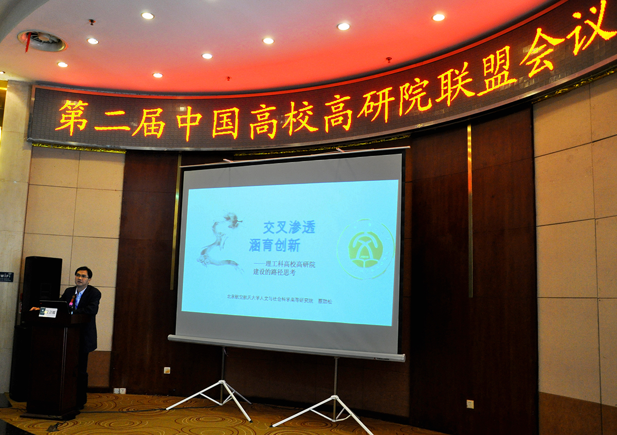 北航高研院院长蔡劲松教授在会上做了题为《交叉渗透,涵育创新——理工科高校高研院建设的路径思考》的交流发言。他指出,办好理工科高校高研院,平台建设是核心、机制创新是关键、资源整合是手段、协同发展是目的,必须从学校实际出发,交叉渗透、特色发展。要深入思考并树立“学术导向意识、突破隔阂意识、前沿交叉意识、涵育创新意识”等四个意识,处理好“校内与校外的关系、特色与多元的关系、发展与机制的关系”等“三个关系”。他还以北航高研院成立六年来的成功探索与实践为例,结合“十三五”建设,就北航高研院“融汇中西、贯通古今、承续文化”的宗旨,“交叉渗透、涵育创新”的理念,以及“四个坚持”的建设路径,同与会兄弟高校高研院同仁们进行了深入交流。
