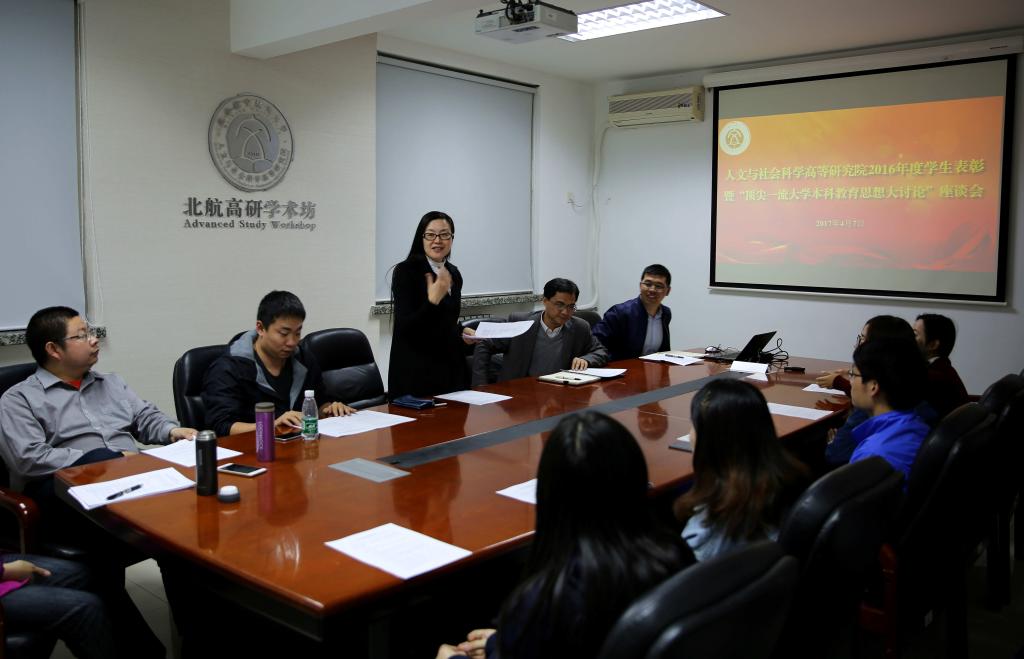 4月7日下午,beats365亚洲体育投注2016年度学生表彰暨“顶尖一流大学本科教育思想大讨论”座谈会在西办公楼一层105高研学术坊成功举办,高研院蔡劲松院长、李亚梅书记以及教师代表、教务秘书、辅导员及部分获奖学生代表出席了座谈会,座谈会由专职辅导员王佳发主持。