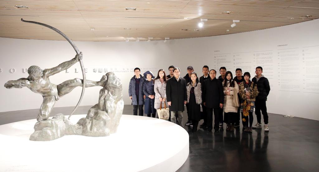 随后,高研院师生来到清华大学艺术博物馆,艺术博物馆傅加老师热情接待了教学实践团队,并全程为大家做了精彩而详细的讲解。在艺术博物馆一层,实践团队有幸观看了世界三大雕塑家之一的“回归·重塑:布德尔与他的雕塑艺术”展览,该展聚焦法国著名雕塑家安托万·布德尔19世纪末至20世纪初的杰作。安托万·布德尔是法国著名雕塑家、画家和教育家,1861年出生于木工家庭,15岁便进入图卢兹美术学校学习,8年后进入巴黎美术学院学习,后经推荐进入罗丹工作室,成为罗丹得力的助手和亲密无间的挚友,布德尔的雕塑受罗丹美学思想的影响,同时他又开拓出一条独具个人风格的艺术道路。此次展览重新审视布德尔回归古希腊罗马神话题材而创作的作品,展示艺术家个人艺术风格日臻成熟完善时期的代表作,包括38件青铜雕塑作品,2件油画作品,8件水彩作品,素描及珍贵历史图片等,所有展品均来自法国布德尔博物馆的馆藏,这也是布德尔的雕塑作品建国以来首次在国内亮相。在艺术博物馆傅加老师的带领下,教学实践团队还分别观看了“布德尔的创作之源” “帕拉斯(1887-1905)”“阿波罗(1898-1909)”“弓箭手赫拉克勒斯(1906-1909)”“果实(1902-1911)”“珀涅罗珀(1905-1912)”和“香榭丽舍剧院与垂死的人马(1910-1914)”等七个单元的展览。