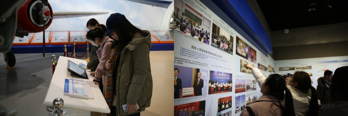 件件实物,张张照片见证了北航的艰苦卓绝,伟大成绩不是喊出来的,是北航人一点一滴用血汗铸就的。一层展馆陈列的飞机,从“北京一号”到“歼十”,更带给同学们最直观的震撼体验。