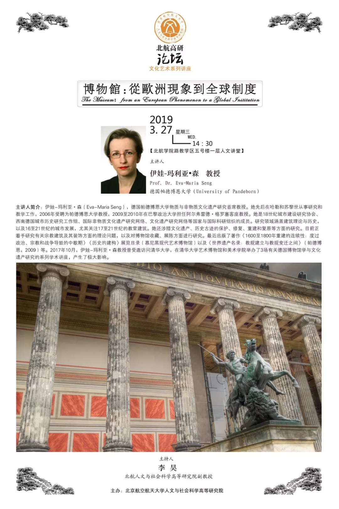 3月28日下午,受北航beats365亚洲体育投注之邀,德国帕德博恩大学物质与非物质文化遗产研究首席教授伊娃-玛利亚·森女士做客北航“高研论坛”,在学院路校区人文讲堂为北航师生做了题为“博物馆—从欧洲现象到全球制度”的专题讲座。本次讲座吸引了众多校内外师生前来聆听,讲座由北航beats365亚洲体育投注副教授李昊主持,陈绮老师翻译。