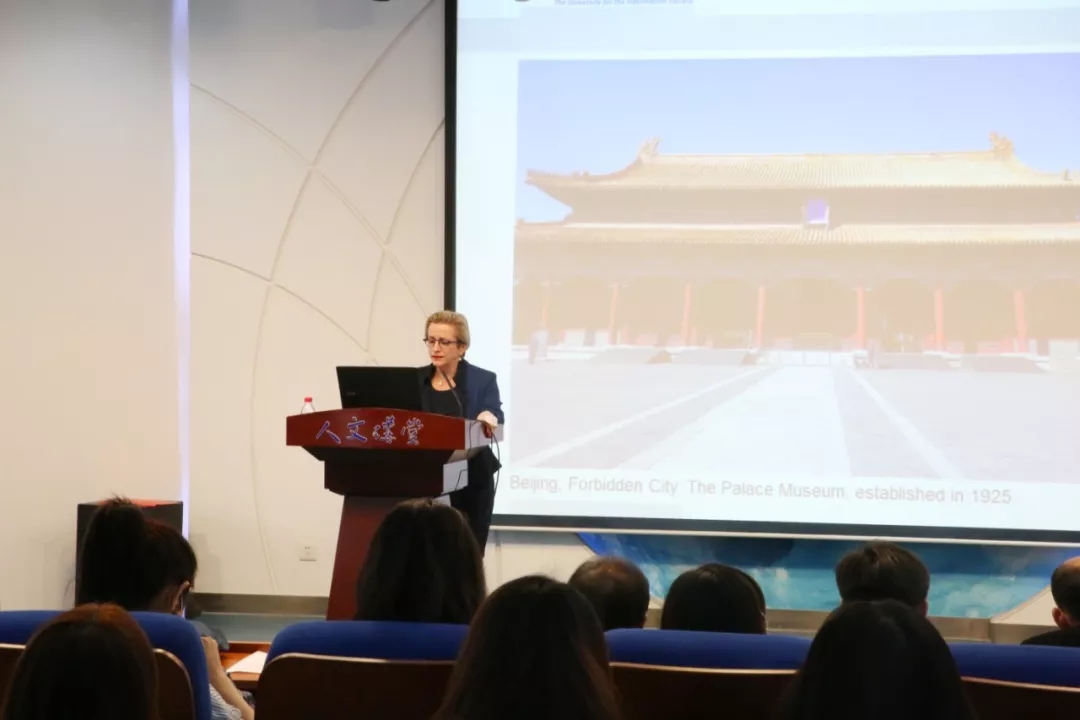 伊娃·玛利亚·森教授首先介绍了中国近代以来博物馆事业的发展概况,她以精准的数据统计,系统阐释了1949年以来中国博物馆建造发展的数量和观展人数的增长,讲述了中国历史上大量博物馆文物的迁移、保护和收藏情况,同时以故宫博物院和台北故宫为例,向现场师生展示了博物馆建造的特点和珍贵的皇家收藏品。