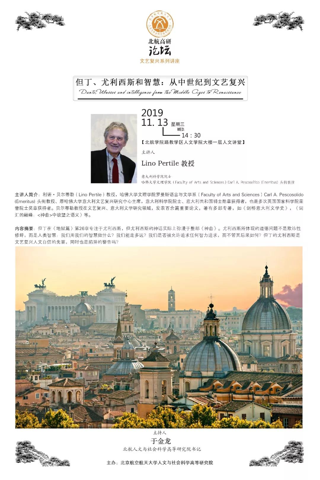 11月13日,由哈佛大学利诺·贝尔蒂勒教授主讲的“但丁、尤利西斯和智慧:从中世纪到文艺复兴”在人文讲堂成功举办,吸引了众多校内外师生的参与。讲座由高研院于金龙老师主持、陈绮老师翻译。