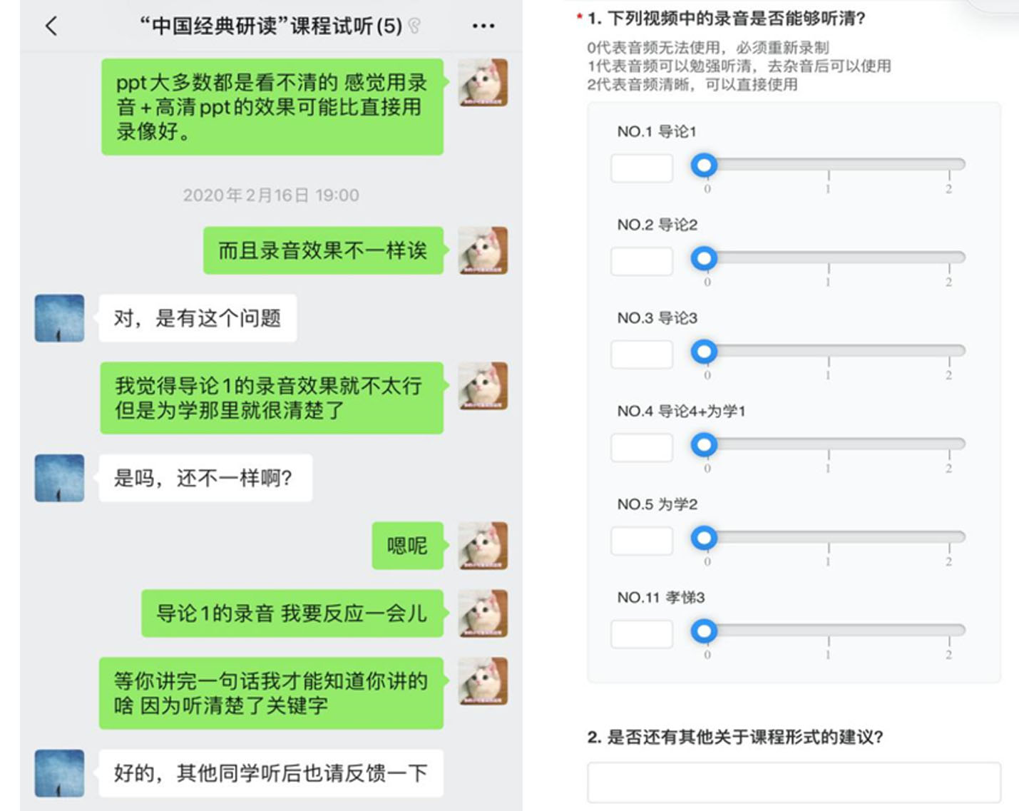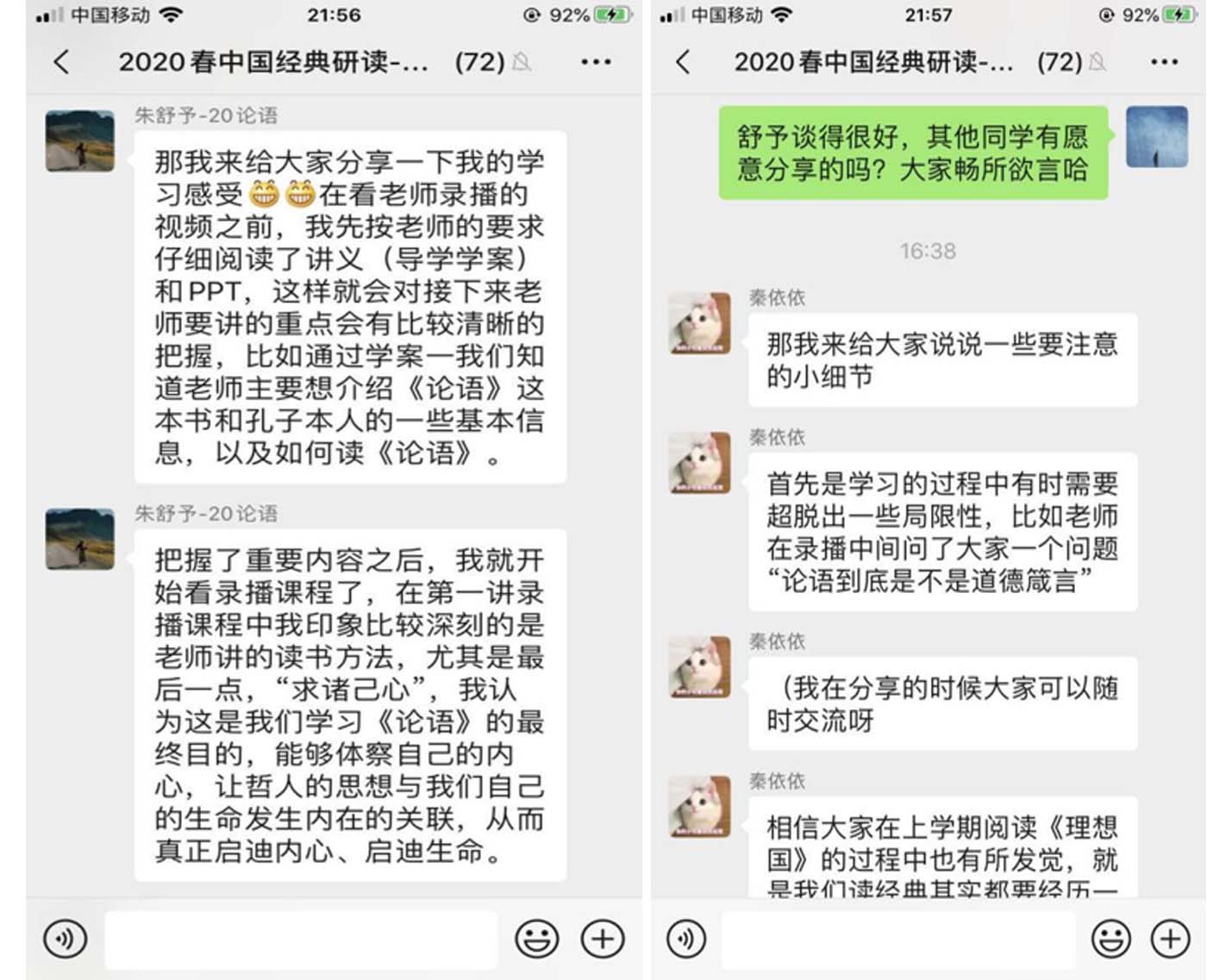 这一新教学模式的核心,在于将录播授课与微信群交流互动有机结合,不仅仅是非常时期的权宜之举,也是对课程教学模式的改进尝试。以往经典研读课教学效果的一个重要瓶颈在于,由于课时、课堂规模等因素的限制,师生之间缺少足够的交流互动,而新教学模式正好可以节省以往的课堂教学时间,为更充分的师生互动与交流讨论创造了条件,使“翻转课堂”教学理念获得真正的实践机会。
