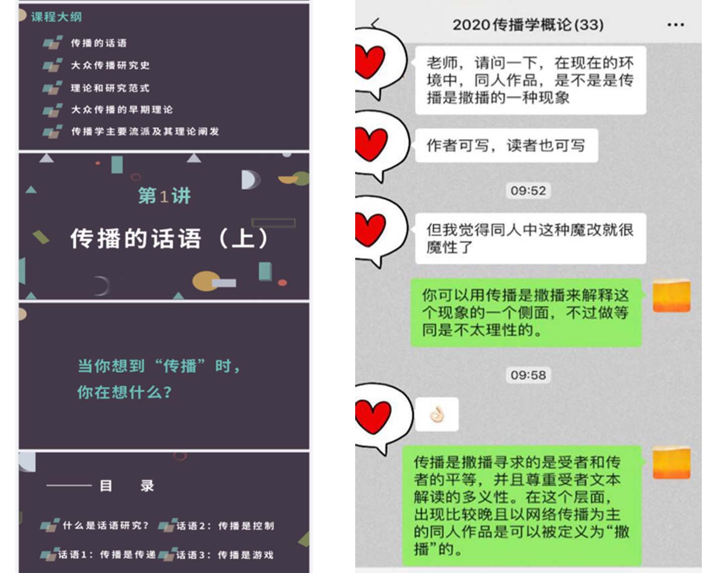 陈思老师为了第一堂课做了充分准备,第1讲的内容为理论性比较强的关于“传播”的话语,对于非人文社科专业的同学而言是一个较新的话题,在2月25日的上午9:50,刚到答疑时间就有同学在微信群中提出了与自己感兴趣的领域相关的问题,老师及时进行了回答,其他同学也积极地加入讨论,并分享了学习资料。有部分个性内敛的同学则加了老师的微信,与老师进行了私信沟通,最终也较好地理解了《传播学概论》的第一课。