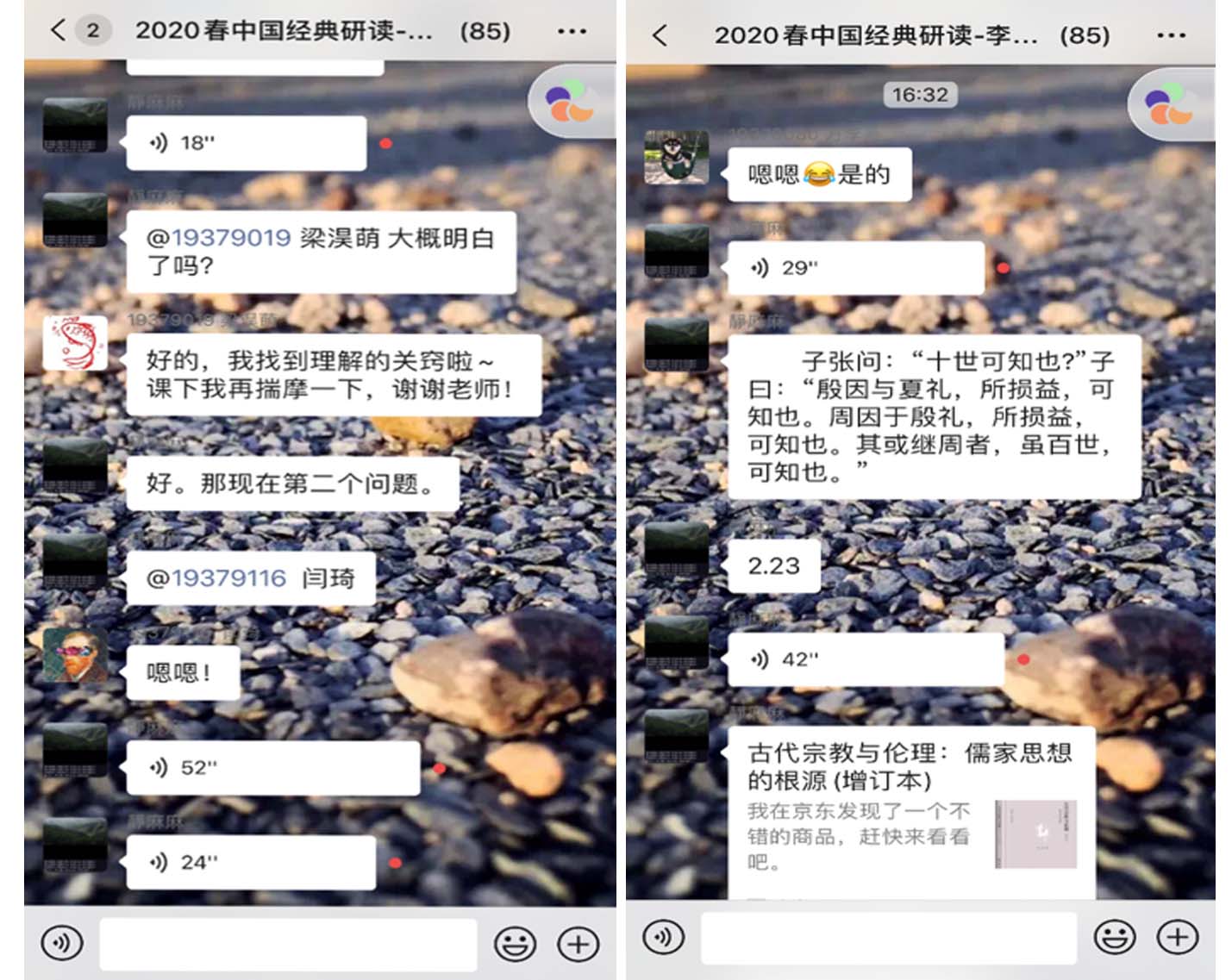 因为是第一次系统接触、阅读、学习《论语》这样一部儒家文化经典,同学们在方方面面都存在着一些疑惑与问题,课堂一开始,同学们便纷纷抛出自己的问题,有的同学从录播课程的讲授中遇到的困惑出发提出问题,有的同学针对具体章句的理解发出疑问,有些同学则更为宏观的文化思想角度出发,提出自己的问题。李静老师根据每一位同学的问题一一用语音进行详尽的解答,并提供进一步的材料拓展,以便同学们在之后进行更深层次的思考。整堂课师生互动不断,课堂氛围十分热烈。