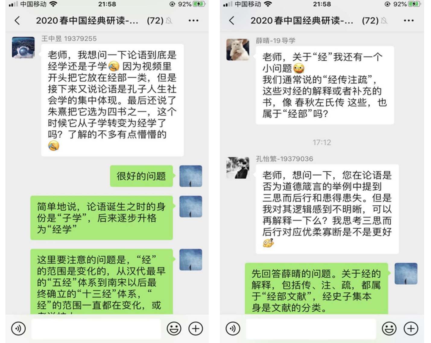李静老师的《中国经典研读》课程微信线上答疑课堂如期顺利开展。李静老师的线上教学采用的是“腾讯课堂录播有声PPT讲授+课程中心推送阅读参考资料+微信群线上答疑”的形式,首次微信群内的答疑课堂便取得了很好的效果。
