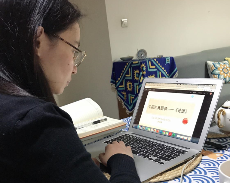 罗旻老师在筹备《中国经典研读》课程中采用了录播课的形式。在筹备课程的过程中也曾遇到一些小问题,但看到同学们反馈“完全可以,听得很清楚”时,心里感到十分欣慰。相信录播课可以反复观看的形式和特点可以帮助同学们更加深入的理解课程内容。