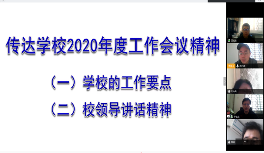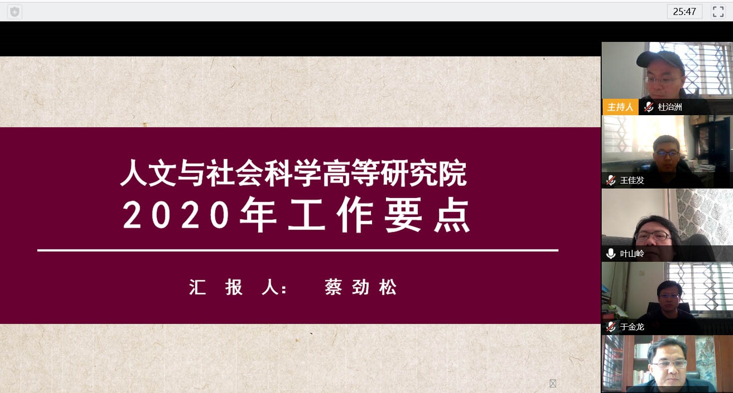 为进一步传达和落实学校2020年度工作会议精神,统一思想、凝聚共识,更好推动学院各项重点工作,高研院于3月18日下午以腾讯视频会议方式召开了学院2020年度工作视频会,蔡劲松院长,于金龙书记及全体教职工参加了视频工作会,本次会议由杜治州副院长主持。
