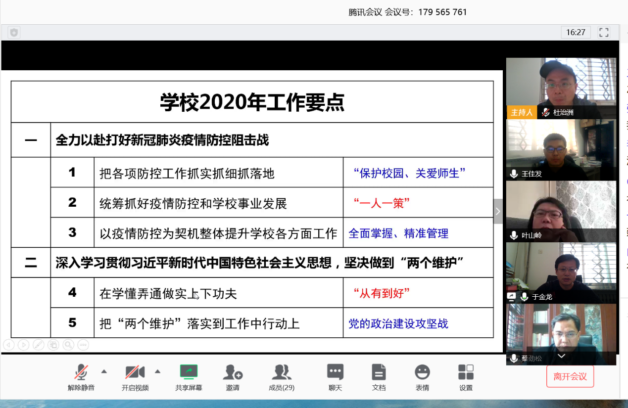 于金龙书记首先向全院教职工传达了学校2020年度工作要点,他从9个部分33项重点工作对学校工作要点进行了解读,集体学习了校党委曹淑敏书记关于疫情防控工作的讲话精神,并对学院疫情防控工作进行了通报和重点部署。