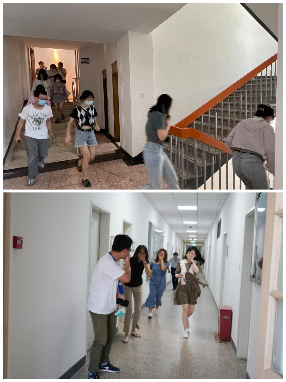 上午10点整,演练活动正式开始。教学区7号楼二层会议室发现虚拟的着火点,就近人员报警;由消防控制室人员广播传达紧急疏散通知。伴随探测器的警报和疏散指令,教学区7号楼1-6层、图书馆西配楼2、3层全体在岗师生迅速按照计划消防路线逃生,弯腰低头、疾步快跑。