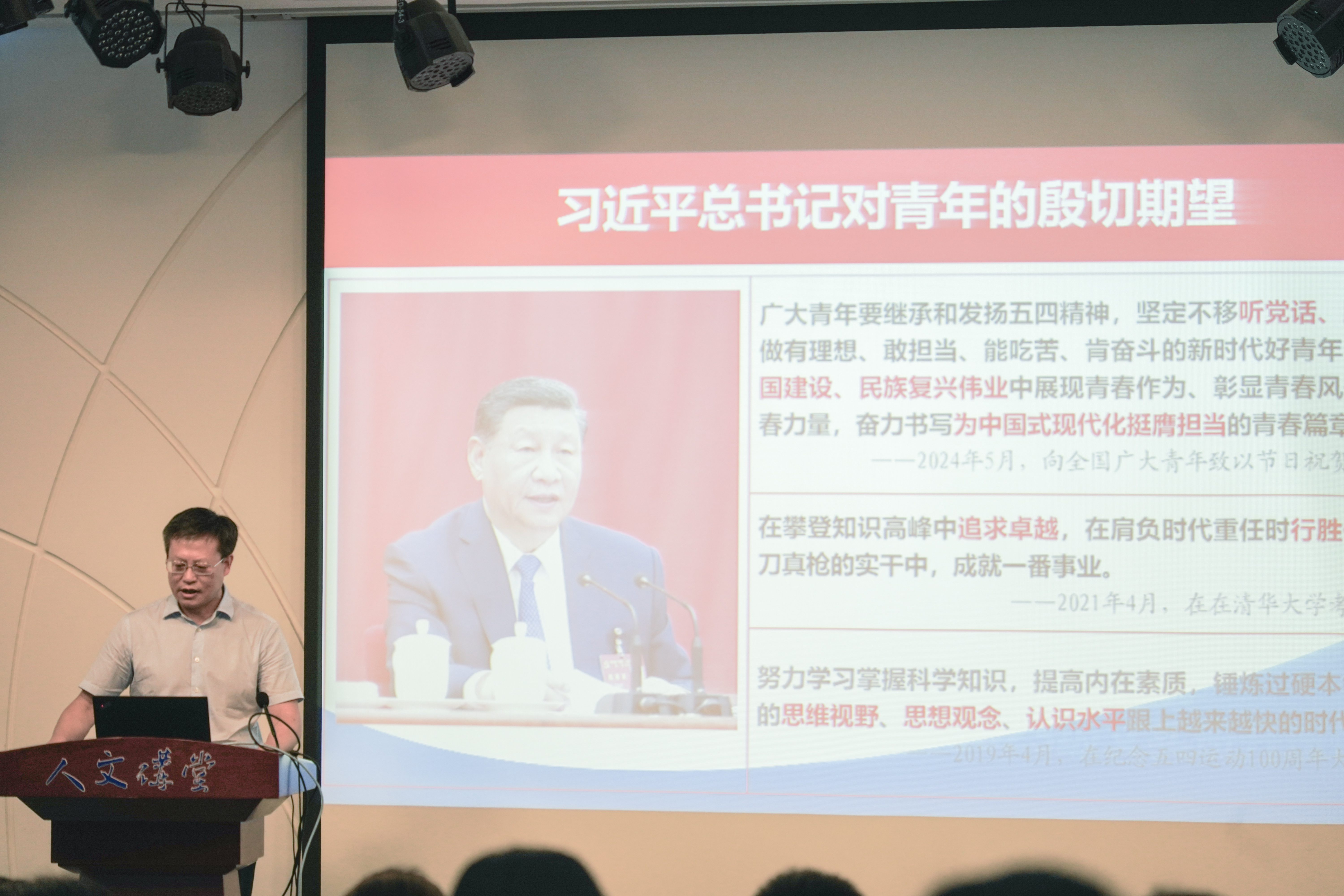 于金龙书记以“挺膺担当,追求卓越”为主题作了报告,提到了习近平总书记对青年的殷切期望,并向研究生和本科生提出了三点希望:一是境界高远成为积极主动勇担使命的“自燃型”青年;二是锤炼本领提升学习能力、拓展知识面、向提升思维能力让思考成为习惯;三是安全规范强化安全意识、规范意识,遵守学术诚信。他特别强调,当代大学生作为担当民族复兴大任的新青年,不能被动等待、被动应付,而应该主动努力、主动提升,将自己培养为具有独立思考和深度思考能力的人才。于金龙书记还为研究生新生讲解了研究生手册中的内容,他指出,研究生手册不仅是规范与流程的指南,更是培养严谨治学态度和科研诚信的基石。他要求研究生们认真研读手册,遵循科学精神、遵守学校规定、坚决抵制学术不端行为,并充分利用手册中提供的信息,积极投身科研为实现中国梦贡献青春力量。