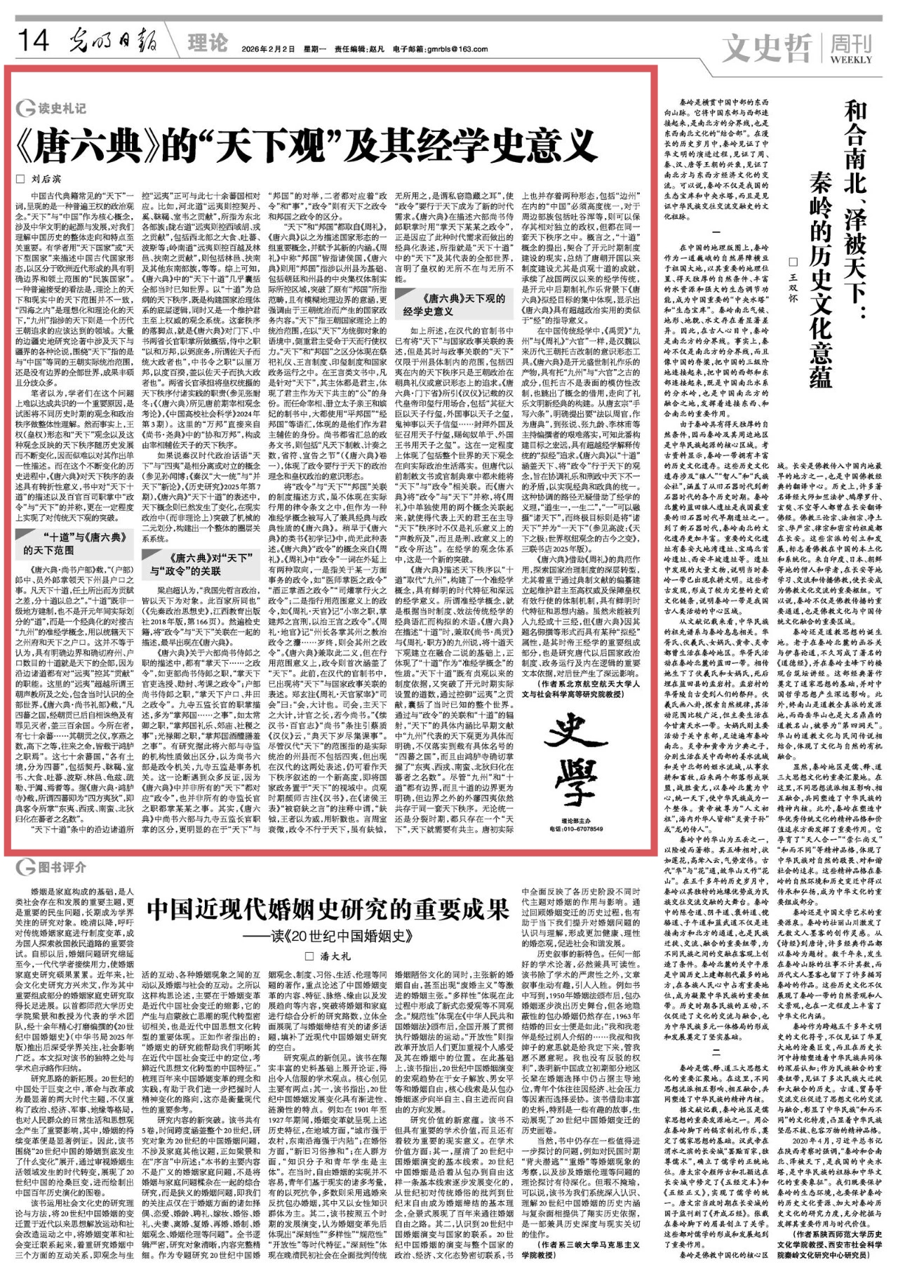 《光明日报(理论版)》2026年2月2日【读史札记】栏目刊发北航高研院教授、院学术委员会主任、古典与区域文明中心暨通识教育中心主任刘后滨署名文章《<唐六典>的“天下观”及其经学史意义》。