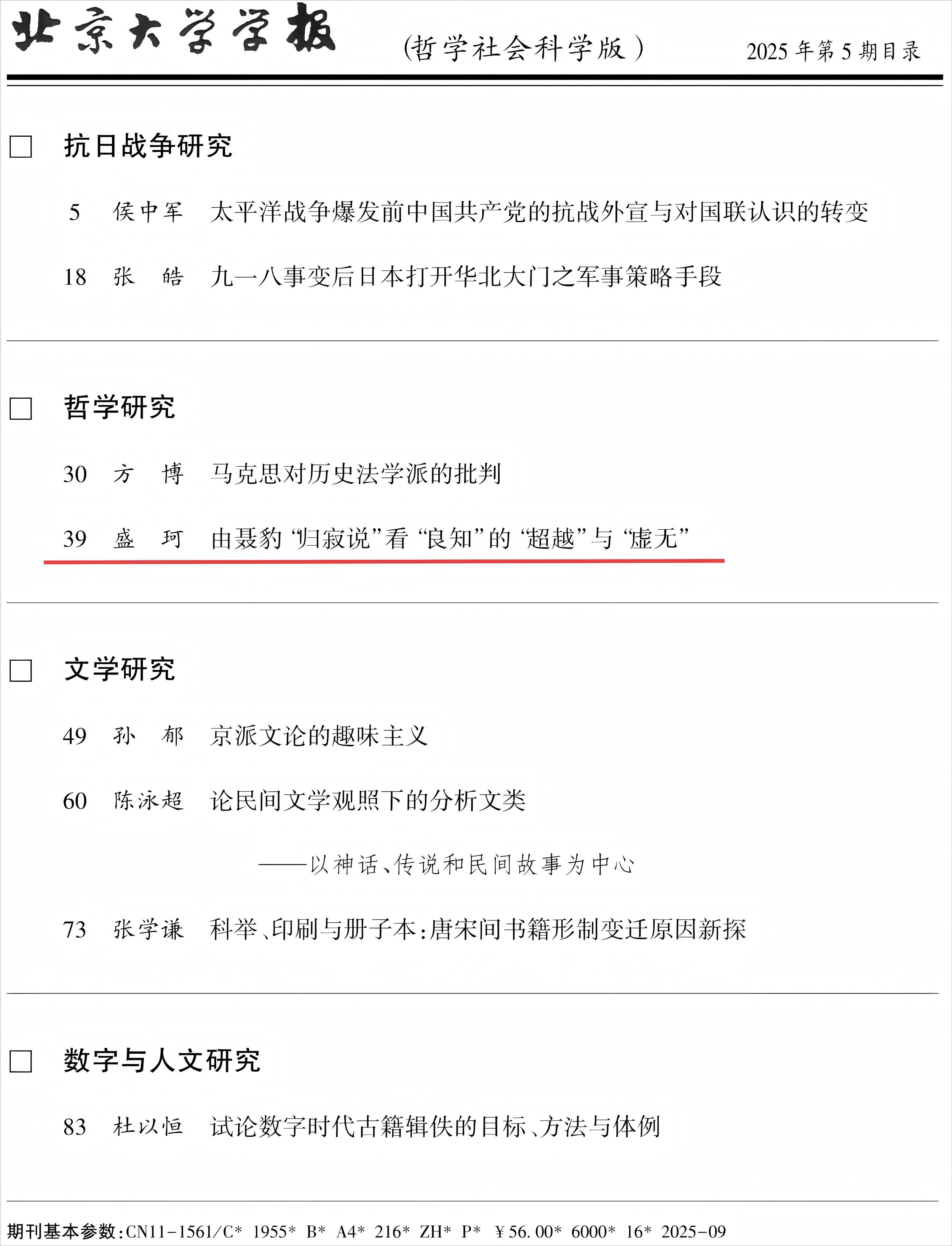 近日,北航高研院教授、中国哲学研究所主任盛珂在《北京大学学报(哲学社会科学版)》2025年第5期发表论文《由聂豹“归寂说”看“良知”的“超越”与“虚无”》。