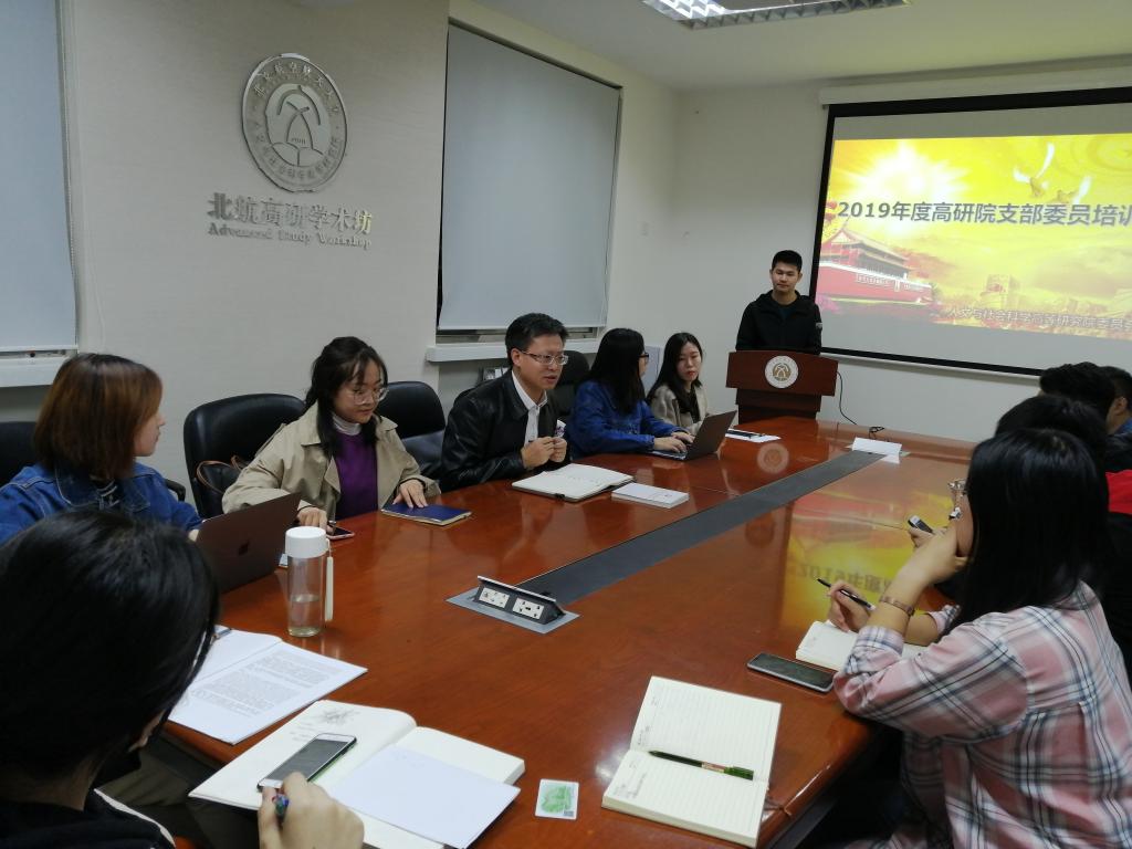 2019年10月18日晚19:00,北航beats365亚洲体育投注党委召开2019年度高研院支部委员培训会。会议旨在从工作的实际需要出发,围绕发展党员的相关规定对支部委员进行系统培训,为近期扎实开展好向党推优、发展党员相关工作做好思想上和行动上的统一。本次会议由高研院党委书记于金龙主持,高研院2016级本科生党支部书记李家强主讲。高研院党委下辖各党支部委员14人参与培训。