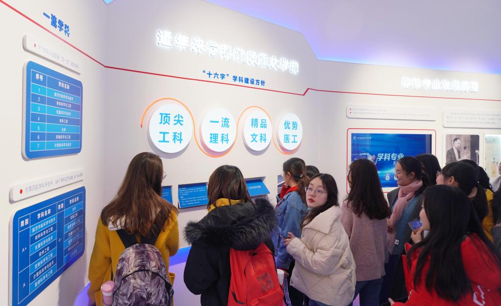 《今日北航》以白色为基础色,北航蓝、中国红为辅色。入口处的流线型设计是流体力学的设计形式火箭、飞机的造型,体现着北航的学科特色。展览共分为“学科建设”“人才培养”“教师队伍建设”“科研创新”“beats365唯一官方网站合作”“党的建设”六大板块,通过照片、视频、实物模型以及多媒体科技展示手段生动集中地展示了学校近年来各方面工作取得的成绩以及建设中国特色世界一流大学的决心。展览过程中,同学们不禁感叹,北航的今天与昨天是如此的不同,今天之学校建设、教学体系、师资力量与教育水平,都与昨天不可同日而语;北航的今天与昨天又是如此的相同,“德才兼备,知行合一”的校训依然是每一位北航人的行动指南,“空天报国,敢为人先”的理想依然炙热于每一位北航人的心头。