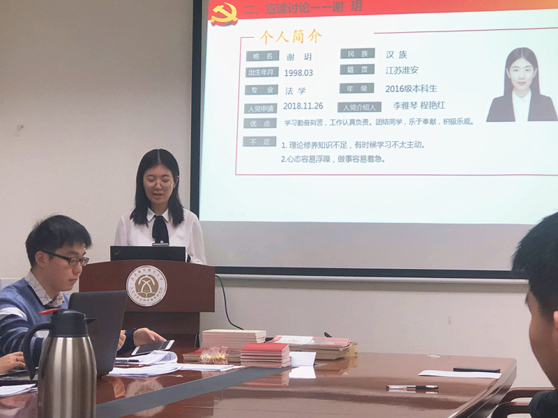 转正大会开始后,全体党员齐唱国际歌,党支部书记秦宇涛同志汇报了会议的出席情况。王帅保、张依、韩天骄、谢玥、张怡帆、张晨曦、姜玥莹、李若钰八名预备党员依次宣读转正申请书,就本人在预备期间表现情况、目前存在的不足及须向组织说明的其他问题进行汇报。每位预备党员汇报结束后,由其入党介绍人说明了对申请人的考察情况。汇报结束后,各位同志针对性地进行了讨论和评议,并由正式党员开展无记名投票。