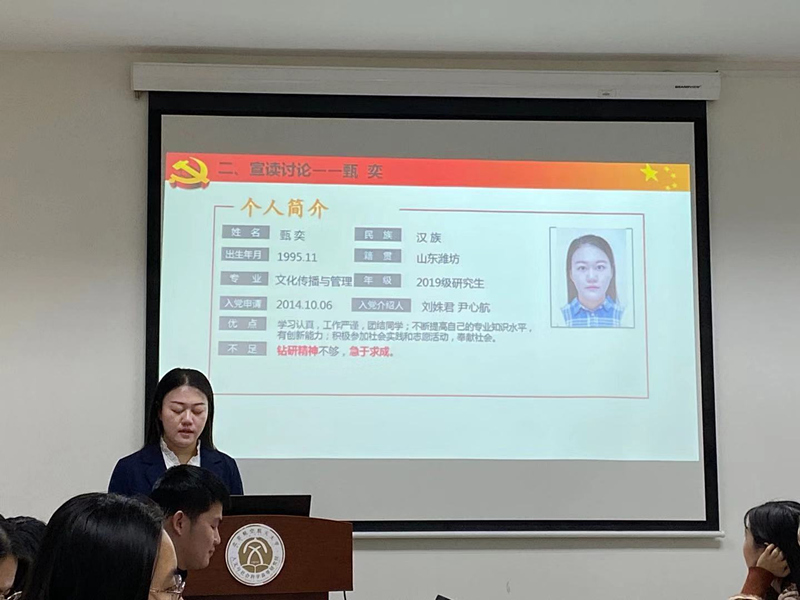 党支部组织委员张学源同学首先汇报了会议的出席情况,到会正式党员11人,依据相关规定,接收预备党员大会可以召开。郝思媛、孙悦依次宣读入党志愿,汇报入党动机、自身优缺点、改进方式及须向组织说明的其他问题。汇报结束后,其入党介绍人汇报了对发展对象的考察情况并由组织委员张学源同志汇报支委会对发展对象的政治审查情况。之后,部分党员针对每位发展对象进行讨论,并由正式党员以无记名投票方式进行表决。