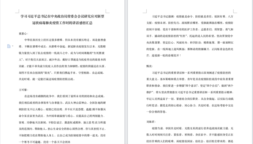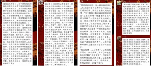 高研院2018级研究生党支部及2019级研究生党支部采取“分散学习+集中讨论”的模式开展学习日活动。由支部书记向大家推送学习资料,随后各位同志分散学习阅读,进行思考并开展线上讨论,分享自己的学习感悟。同志们积极踊跃发言,表明我们要以英雄们为榜样,树立远大志向,在未来国家需要的时候勇敢自信地站出来,守护我们的祖国。当前疫情虽然严峻,但我们仍然充满信心。随后党员们简单总结交流,学习“疫情防控知识大全”,然后分享自身疫情防范的小妙招,从自身做起,为疫情防治贡献自己的力量。活动结束后,大家分别提交了自己的感悟和学习情况。本次学习日活动圆满结束。